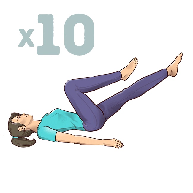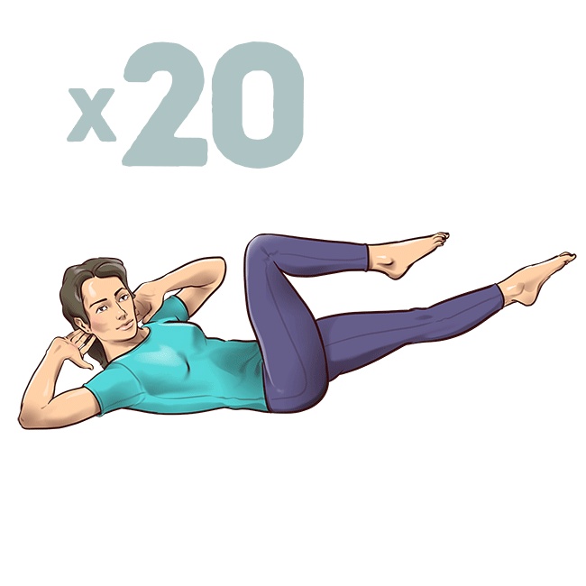 Що робити: перебуваючи у вихідному положенні, вдихніть, підтягуйте одне коліно до протилежного ліктя, інший лікоть залишається лежати на підлозі. Потім випрямляйте зігнуте коліно на вазі, в той же час підтягуйте інше коліно до протилежного ліктя. Вправа схоже на велосипедну їзду, при цьому без кругових рухів.