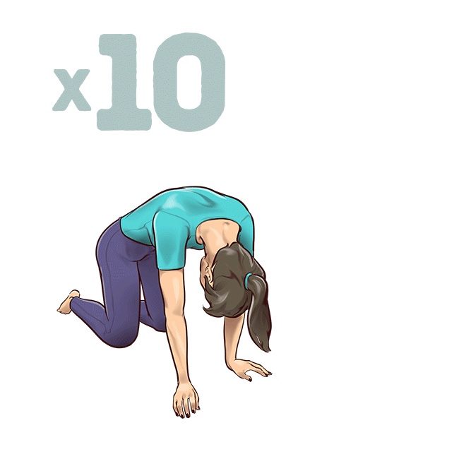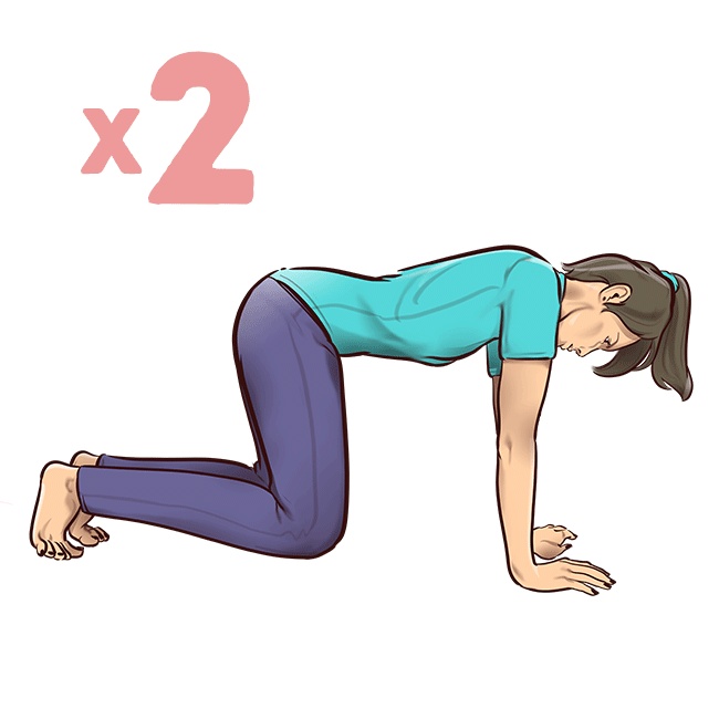 Що робити: "кішка": глибоко і вільно дихаючи, не виходячи з прийнятого положення, вигніть дугою спину і зафіксуйте таке становище на 15 або 30 секунд. "Верблюд": з вихідного положення прогніться у напрямку до підлоги, формуючи при цьому ту ж дугу, але тільки у зворотному напрямку. Зафіксуйте це положення на 15 або 30 секунд.