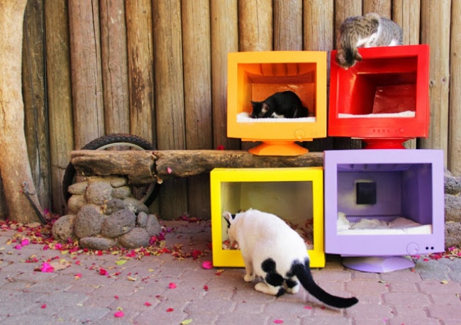Старий монітор отримує друге життя і стає стильним і затишним будиночком для кота. А якщо їх завалялося відразу кілька штук, то можна побудувати справжнє котяче царство.