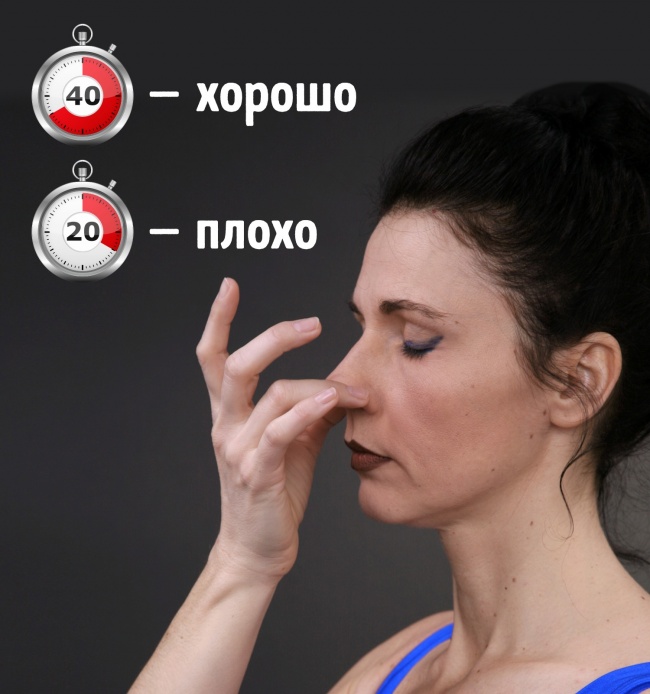 Сядьте і зробіть кілька глибоких вдихів і видихів. Потім вдихніть і затримайте дихання, ніс краще затиснути рукою. За допомогою секундоміра засічіть час затримки. Нормальний результат у здорової людини не повинен бути менше 40 секунд для чоловіків і 30 секунд для жінок.