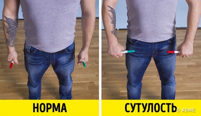 Ще один простий тест допоможе виявити сутулість. Затисніть в долонях 2 олівця або ручки, опустіть руки вздовж тіла. Якщо олівці паралельні один одному, ваша постава в порядку. Якщо олівці показують один на одного, значить, ви сутулитеся.