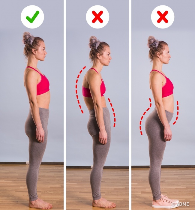 Візьміть вашу природну позу і попросіть кого-небудь поспостерігати за вами. Якщо ваша спина округлюється на 45° і більше, а стегна виступають вперед, це говорить про серйозне викривлення, можливо, у вас кіфоз. Увігнутість в попереку теж сигналізує про порушення постави. В цьому випадку вам краще звернутися до лікаря за точним діагнозом і лікуванням.