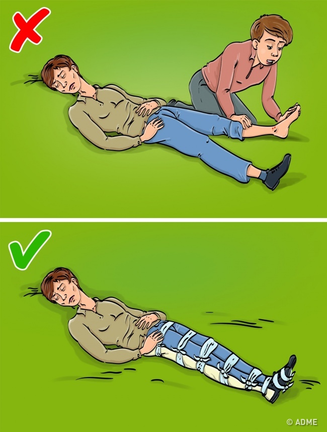 Визначити, яке саме пошкодження отримав потерпілий, можна тільки за допомогою рентгена. Тому єдине, що необхідно зробити, це знерухоміти місце пошкодження, не розгинаючи і не згинаючи пошкоджену кінцівку. Для цього можна використовувати будь-які плоскі вузькі предмети, які примотуються таким чином, щоб знерухомити не тільки місце пошкодження, але і розташовані вище і нижче його суглоби. Шина приматывается бинтами по всій довжині, крім пошкоджене місце. Якщо під рукою немає ніяких відповідних предметів, руку примотують до тулуба, а ногу — на іншій нозі.