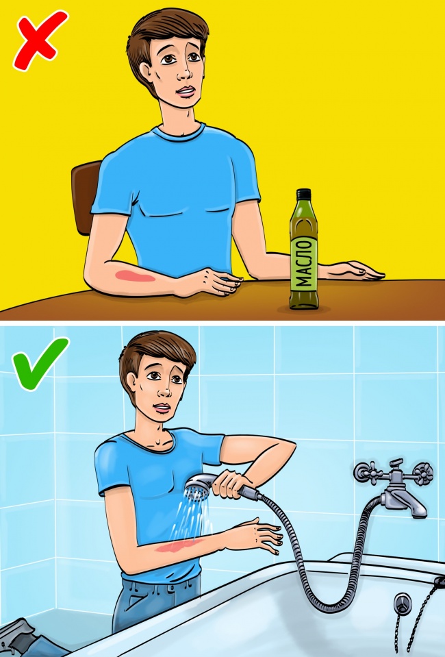 Головні помилки: намагатися видалити залишки одягу з місця опіку, проколювати пухирі.