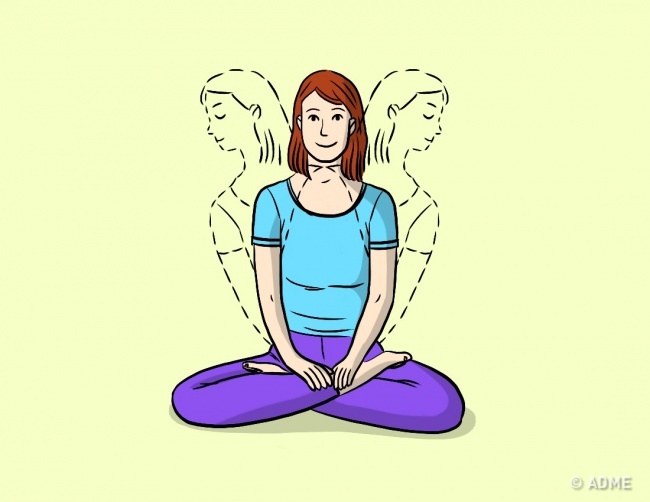 - Сядьте у вихідну позицію і повторіть вправу з пункту 1, піднімаючи плечі на вдиху і опускаючи на виході.