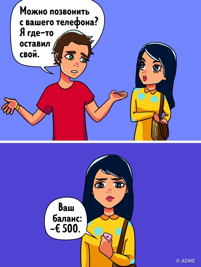 На вулиці до вас може підійти дуже переляканий або спантеличений чоловік. Він попросить зателефонувати, так як втратив свій телефон, або скаже, що його пограбували. В результаті дзвінок буде коштувати вам цілого стану. Шахрай просто подзвонить на заздалегідь приготований номер, і під час цієї розмови у вас знімуть всі гроші. Не переживайте, вони обов'язково надійдуть на рахунок злодюжки.
