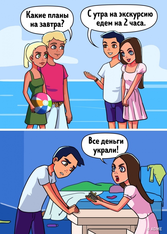 Щоб цього уникнути, користуйтесь номерами в готелі або бунгало, в яких обов'язково є сейф. І намагайтеся менше розповідати малознайомим людям про свої плани під час відпочинку.