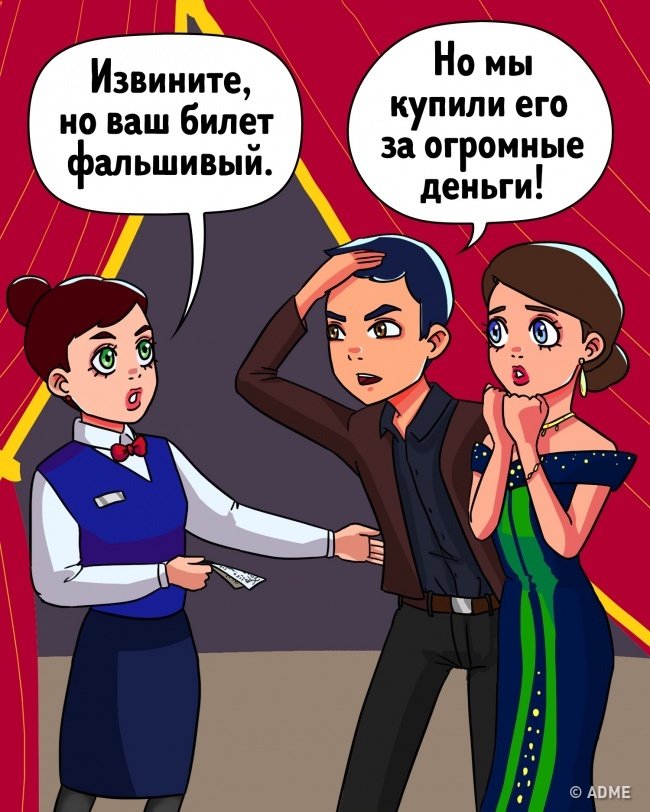 У випадку якщо ви купите квитки в театр, на концерт, в музей або ще куди завгодно з рук, великий шанс, що квиток виявиться липовим. Але якщо все ж справжній квиток, є ймовірність, що вам продадуть його втридорога.