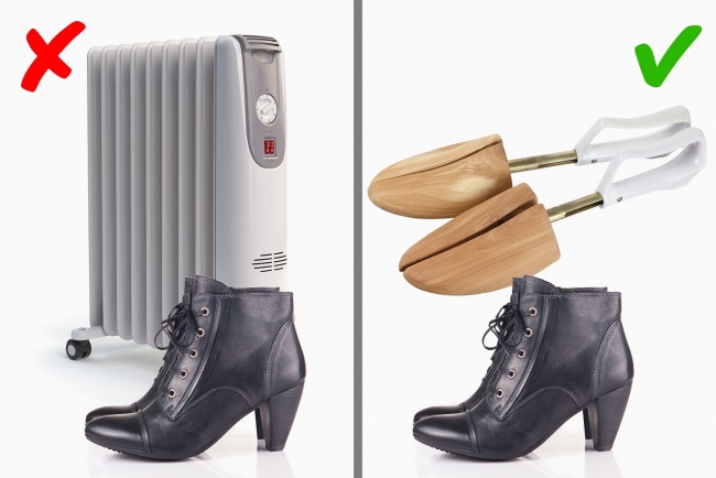 Неправильно. Сушити взуття біля приладів обігріву: матеріал надто швидко висихає і є ризик появи тріщин.