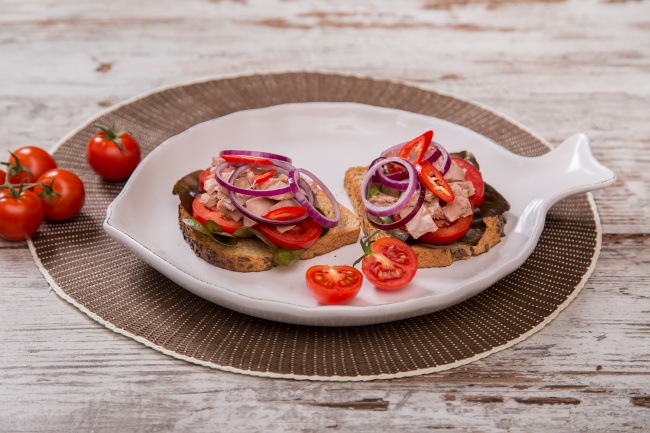 - На хліб викладаємо листя салату, помідор, тунець і зверху кільця цибулі.