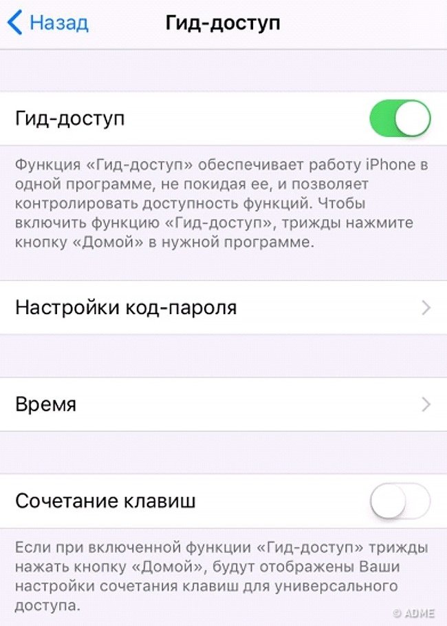 Гід-доступ — доступ тільки до відкритих програм на iPhone. Завдяки цій функції ви можете абсолютно спокійно давати в руки ваш телефон для «просто перевірити пошту» тим людям, від яких хочете приховати особисте. Включити функцію можна в налаштуваннях універсального доступу.