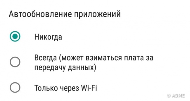 Відключите автоматичне оновлення додатків, щоб масова завантаження нових версій встановлених додатків не вводила в ступор ваш гаджет. Це особливо корисно для тих, у кого не дуже потужний смартфон. До речі, ви можете поставити заборону на оновлення одного певної програми.