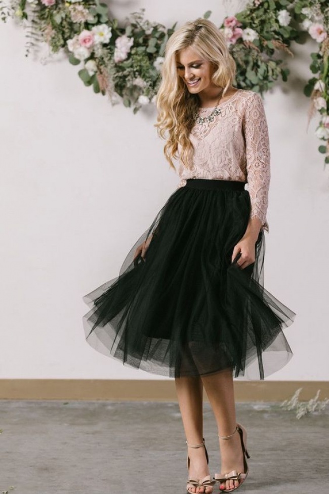 Пишна спідниця з фатину, у комплекті з мереживним боді — жіночний і милий варіант новорічного вбрання.