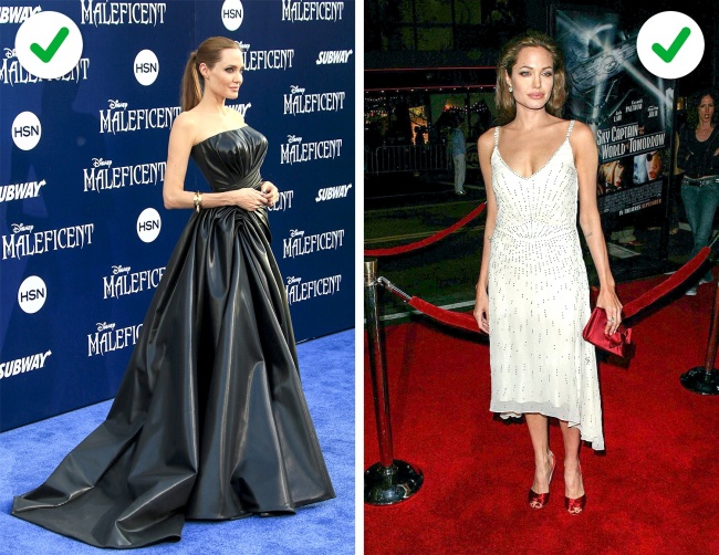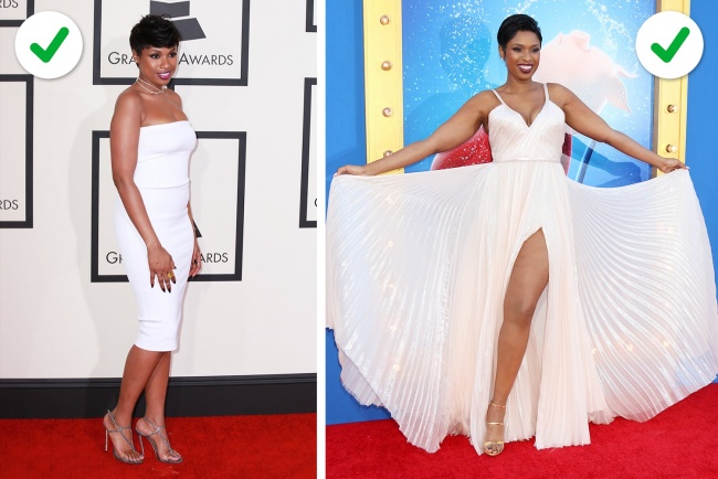 Гріх приховувати таку красу, але якщо хочеться трохи прибрати обсяг, ми радимо вибирати сукні, розкльошені до низу. Тут діє просте правило: чим ширше низ, тим вже здаються стегна. Добре підійде прийом відволікання уваги. Глибоке декольте, химерні комірці і — вуаля — круглі, об'ємні форми не так кидаються в очі.