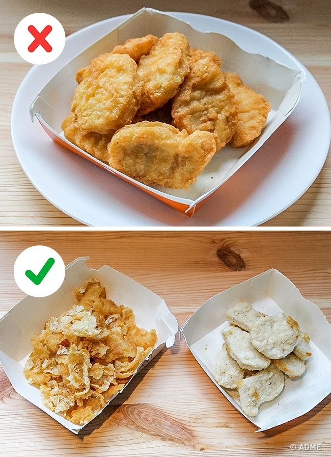 Куряча грудка — це корисний продукт. Але курячі нагетси в панірувальних сухарях обсмажують у великій кількості олії. А в киплячому маслі утворюються канцерогени. Тому якщо ви хочете мінімізувати шкоду від нагетсів, очистіть їх від панірування.