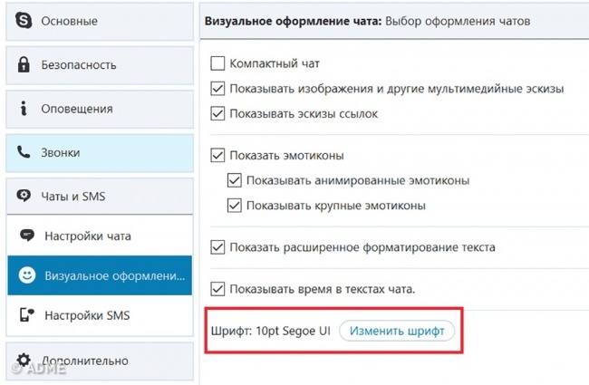 За замовчуванням тексти в Skype набираються 8-м кеглем, який незручно читати при поганому зорі. Але досвідчені користувачі знають, що текст повідомлень можна змінити наступним чином: «Інструменти» — «Налаштування» — «Чати і SMS» — «Візуальне оформлення» — «Змінити шрифт».