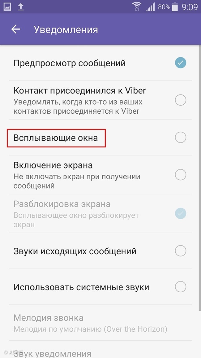Один з найбільш дратівливих моментів у Viber — це величезні спливаючі вікна з новими повідомленнями, які автоматично включає підсвічування екрану. По-перше, це зайва витрата батареї, а по-друге, хто завгодно може прочитати повідомлення, якщо ви залишили телефон на столі. Зайдіть в «Налаштування» — «Повідомлення» і приберіть галочку з пунктів «Спливаючі вікна» і «Підсвічування екрану».