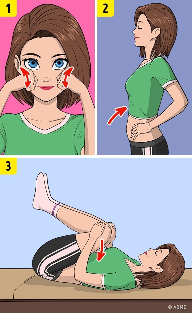 - Втягніть живіт і різко роздмухати його. 20 повторень допоможуть прибрати застої крові та жовчі в організмі.