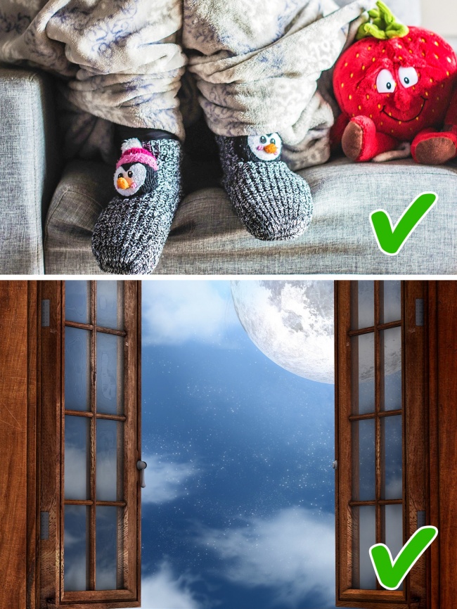 Дослідження показали, що тепло кінцівок і швидкість засинання знаходяться в прямій залежності. У рукавицях йти в ліжко не варто, а ось в шкарпетках — цілком! Тим, хто лягає спати в шкарпетках, не потрібні зайві ковдри: різких перепадів температури тіла не буде, а значить, і пробудження посеред ночі теж.
