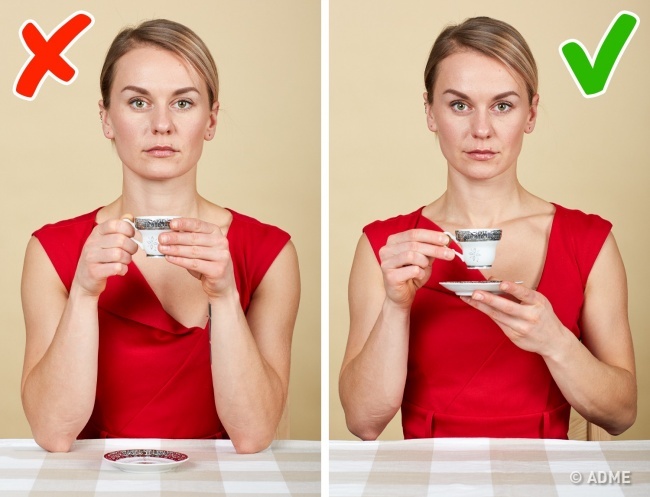 Чашку з чаєм тримають за ручку однією рукою, а другий тримають блюдце. Вважається непристойним тримати чашку двома руками і залишати блюдце на столі.