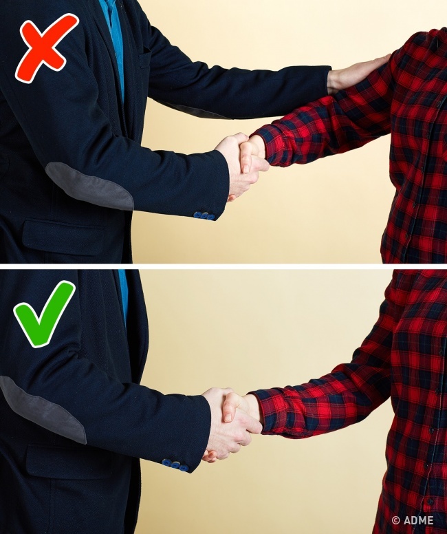 - Обмінюватися рукостисканням варто швидко, не затримуючи і не притягаючи до себе чужу руку. Поважайте особистий простір співрозмовника, поплескування по плечу навіть доброго знайомого вважається безтактністю.