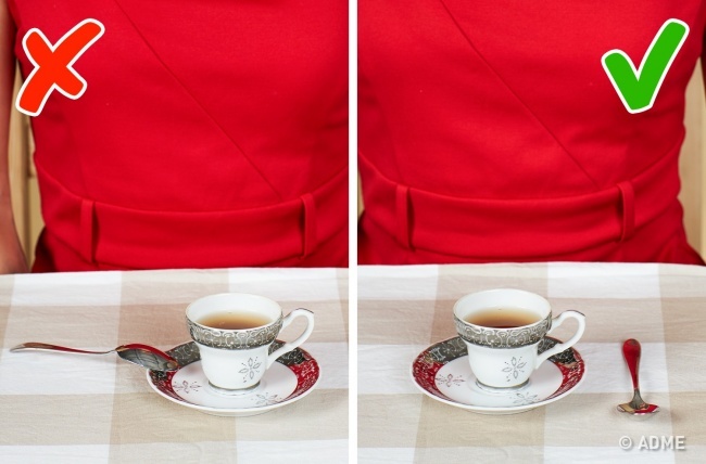 Ложку в чашці не залишають, а кладуть збоку від блюдця. Не можна класти ложку саме в блюдце.