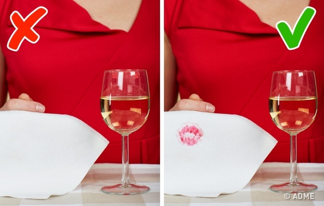 Для жінок важливо переконатися, що помада не залишить слідів на келиху. Перед вживанням спиртного промокніть губи серветкою.