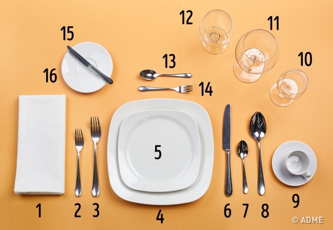 1 — Серветка (стелиться на коліна). 2 — Вилка для салату. 3 — Вилка. 4 — Тарілка. 5 — Тарілка для салату. 6 — Ніж. 7 — чайна ложка. 8 — Ложка для супу. 9 — Чашка і блюдце (десерт). 10 — Келих для білого вина. 11 — Келих для червоного вина. 12 — Келих для води. 13 — Десертна ложка. 14 — Десертна виделка. 15 — Десертний ніж. 16 — Тарілка для хліба.