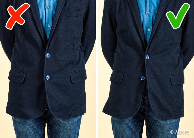 За правилами етикету чоловічого стилю, у піджака варто розстібати нижній ґудзик. Також важливо підбирати піджак під свої потреби і статура:
