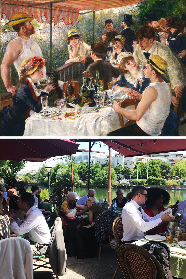 Ренуар любив ресторан Фурнез, часто бував тут, і малював це місце теж неодноразово. Найбільш відома картина, присвячена ресторану, — «Сніданок веслярів». Всі люди на полотні — друзі Ренуара. А ще бачите даму, яка тримає собачку, в лівій частині картини? Це Аліна Шариго, яка пізніше вийде за Ренуара заміж.