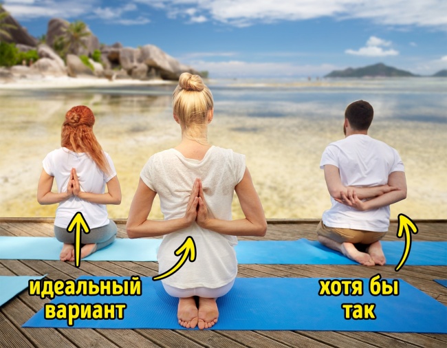 - Якщо дотягнутися рукою до п'яти не виходить — не старайтеся, просто трохи вигинайтеся тому, підтримуючи спину руками. Над гнучкістю ще доведеться попрацювати. Ваш вік — явно не підлітковий.