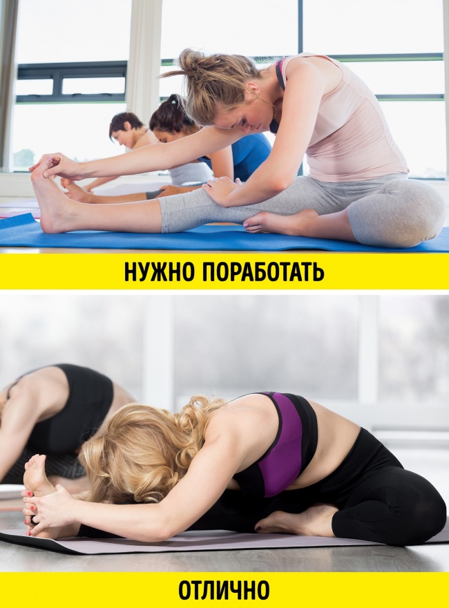 - Якщо дістати не вийшло або нога мимоволі згиналася — суглобам вже не вистачає рухливості, а заднім м'язів стегна — еластичності.