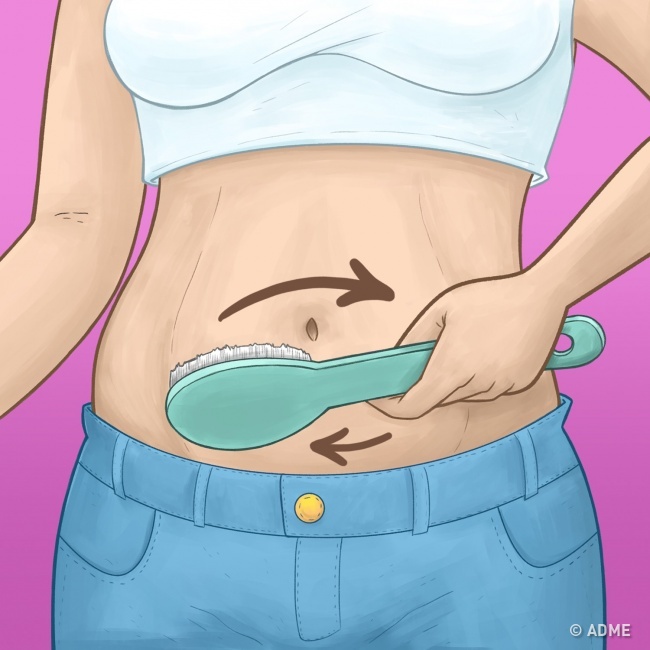 Крок 1. Перед душем сухою щіткою по сухому тілу робимо інтенсивний масаж, всі рухи знизу вгору або кругові за годинниковою стрілкою.