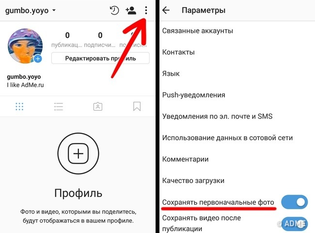 Щоб зберегти фото не тільки в Instagram, але і в пам'ять телефону, зайдіть у свій профіль і натисніть на 3 точки у верхньому правому куті. У меню, активуйте опцію «Зберегти початкове фото».