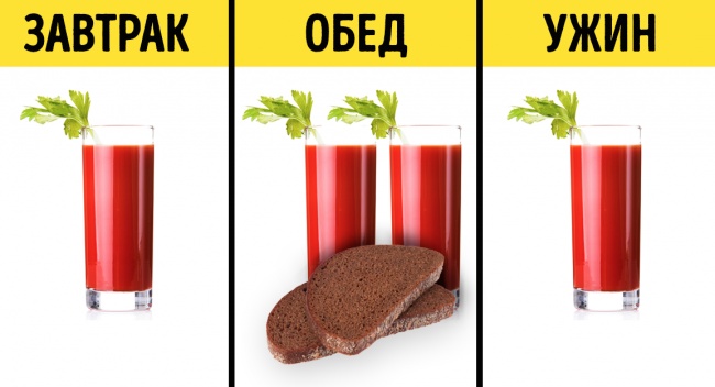 - обід: 2 склянки соку і 1-2 скибочки чорного хліба;