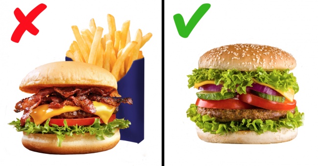 Крім того, що обсяг таких продуктів просто слід зменшити, їм необхідно підбирати гідне «супровід». Наприклад, якщо дуже хочеться гамбургер, то краще з'їсти його з порцією салату з овочів, а не з картоплею фрі.