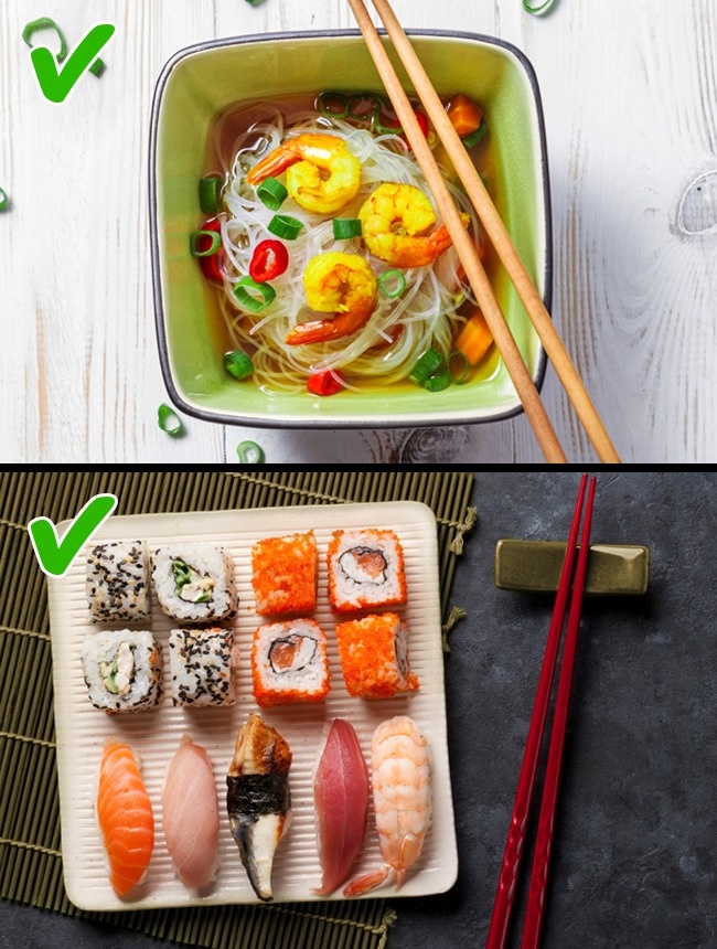 Подібні страви не містять зайвих жирів і консервантів і готуються зі свіжих інгредієнтів: овочів, грибів, морепродуктів, м'яса, водоростей. Поїдання таких смаколиків паличками — додатковий плюс: насичення настає швидше.
