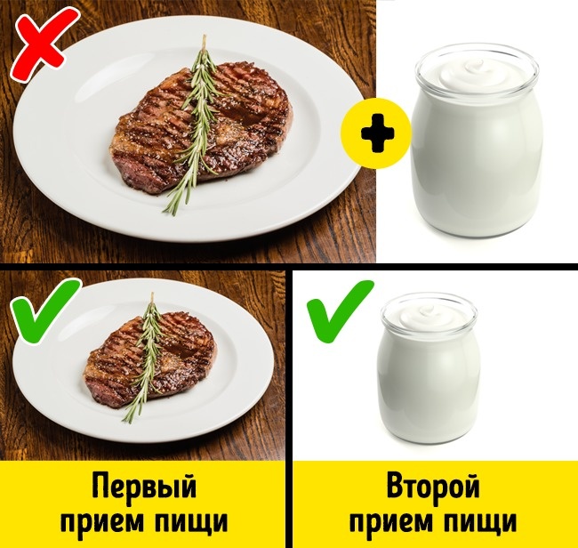 Щоб травлення було здоровим, не слід змішувати в одному прийомі їжі білок різного походження: рибу, м'ясо, яйця і кисломолочні продукти. Наприклад, інтервал між вживанням рибних і м'ясних страв повинен становити не менше 18 годин.