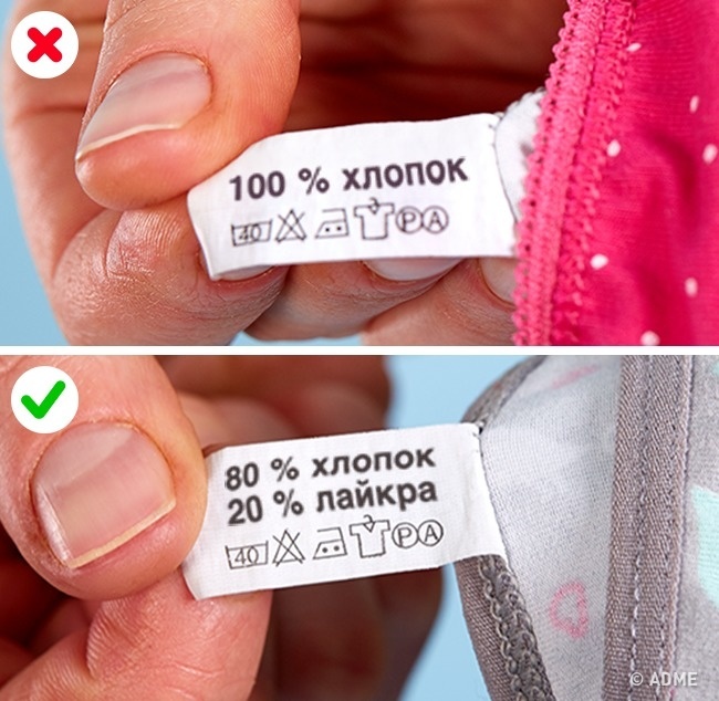 - Кращий варіант для нижньої білизни — це одяг з додаванням до бавовна 20 % лайкри або еластану.