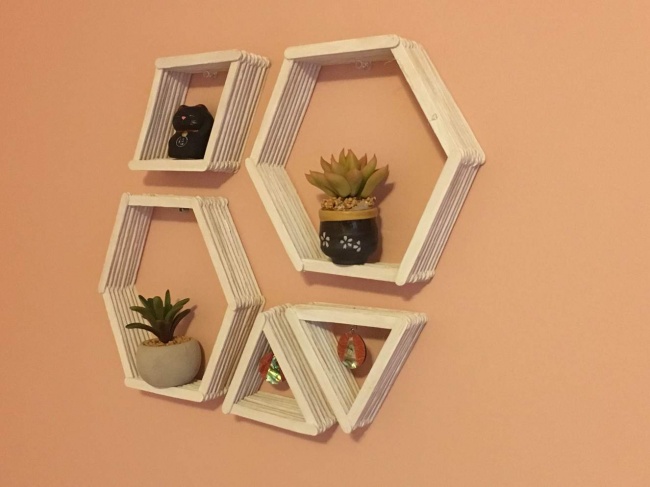 Спорудою таких декоративних поличок можна захопити всю родину, тим більше, що матеріал для їхнього створення простий і доступний — палички від морозива.