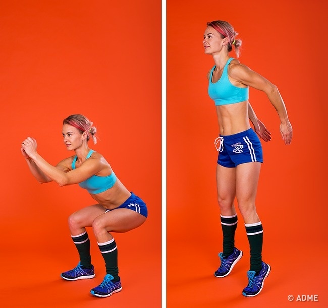 Як і скільки робити: прийміть положення сидячи, розташувавши ноги на ширині плечей. Руки попереду на вазі, зігнуті в ліктях. Потім відштовхніться п'ятами. Важливо під час стрибка утримувати корпус рівно і стежити, щоб зігнуте коліно не заходило за носок. Виконуйте 30 секунд.