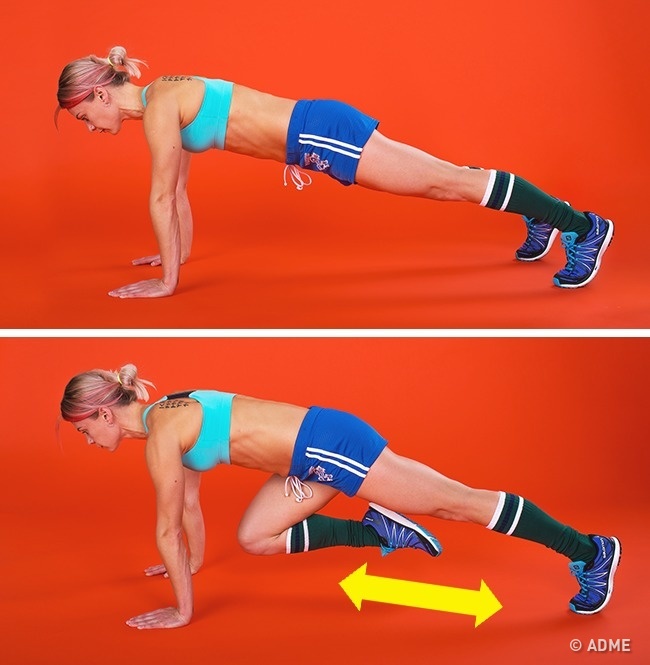 Як і скільки робити: встаньте в планку. Потім, починайте по черзі піднімати коліна до грудей, ніби крокує на високу сходинку. Виконуйте 35-40 секунд.