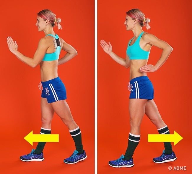 Як і скільки робити: поставте ноги на ширині плечей. Потім починайте стрибати вгору, одночасно переміщаючи в стрибку одну ногу вперед, другу — назад. При приземленні злегка згинайте ноги в колінах. Виконуйте 30-40 секунд.