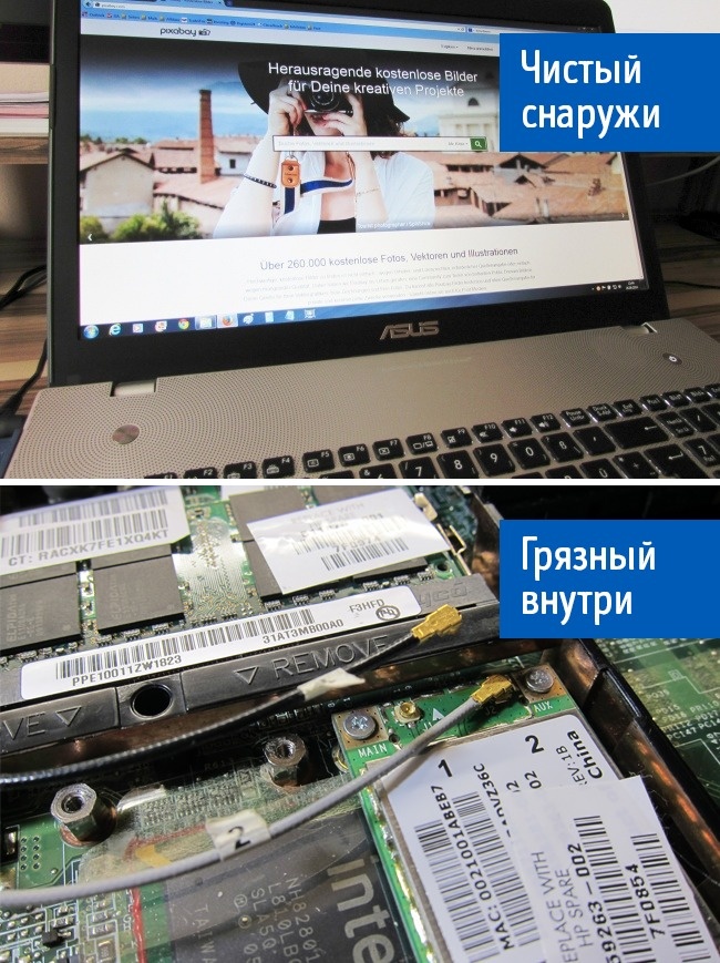 - Ви берете ноутбук на роботу, в поїздки, він розташовується у вас на колінах, то на обідньому столі. Це призводить до того, що до лептопу швидко чіпляються пил і бруд, які майже неможливо розгледіти зовні.