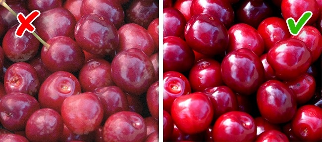 Черешня не менш популярна і часто піддається обприскуванню хімікатами. Зрозуміти, яку вибрати, не так вже й складно: здорова черешня яскрава і однотонна, а тьмяний колір і білясті плями на шкірці сигналізують про наявність пестицидів.