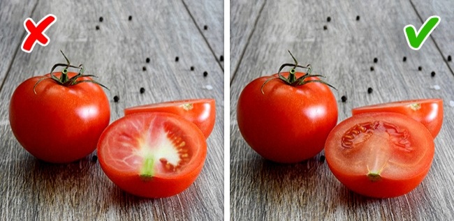 З помідорами все трохи простіше: у здорових ягід тонку шкірку, а м'якоть однотонна. Якщо ж помідор на дотик як пластиковий, а в м'якоті видно білі прожилки, значить, в ньому є нітрати. Крім того, зверніть увагу на плодоніжку — у нормального помідора вона невелика.