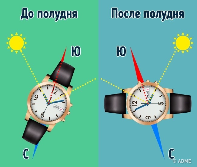 Візьміть наручний годинник і поверніть їх так, щоб годинна стрілка дивилася на сонце. Потім розділіть навпіл кут між годинною стрілкою і цифрою 1. Ця лінія, що поділяє кут, буде вказувати на південь.