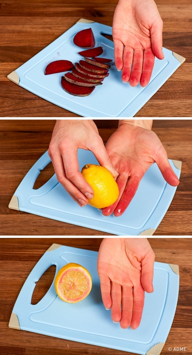 Звичайне мило тільки зміцнює фіолетовий колір. Тому щоб позбутися від потемнілих плям після буряку і ягід, використовуйте лимонний сік або потріть часточкою лимона руки.