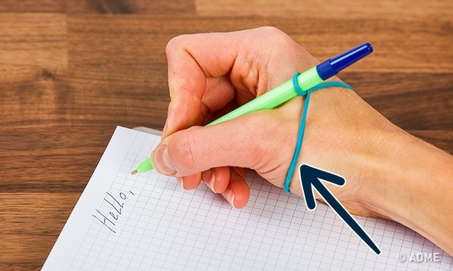 Надіньте канцелярську гумку на руку, потім просуньте в неї ручку ковпачком до кисті і поверніть на 180°. Так ручка буде утримуватися в правильному положенні.