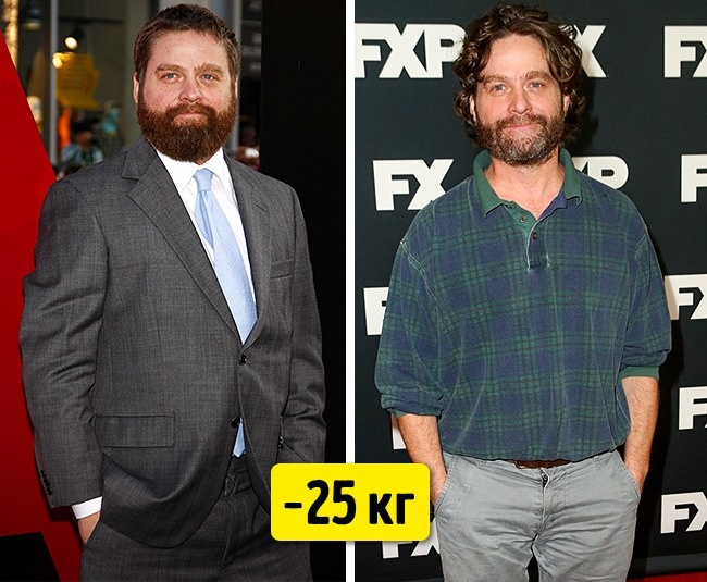 - Зак Галіфіанакіс показав прекрасний результат у боротьбі із зайвими кілограмами. Це коштувало великих зусиль художник, адже для цього йому довелося відмовитися від улюбленого фастфуду та алкогольних напоїв. Зак багато часу ходить пішки — по вулиці, по сходах вгору і вниз.